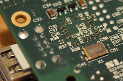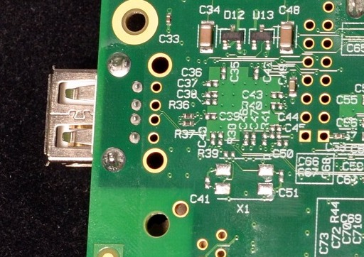 Ahh, activity lights of joy. But there is now no functional USB. Comparing the two boards I notice the Model A is missing most of the SMD mount components around the LAN9512 chip, except for two new resistors (R36 and R37) that don't exist on the Model B.